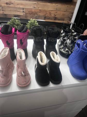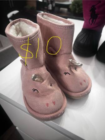 Prices vary. Please see price on pictures. Girls and boys boots 1. Girls blush pink unicorn boots. Size 7 toddler. $10 2. Girls black Ugg like boots. Size 5.5 toddler $10 3. Boys shark rain boots....