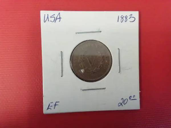 The 1883 USA 5¢ Coin, also known as the Liberty Head Nickel, was designed by Charles E. Barber. Obverse: Features the bust of Liberty facing left, with the word "LIBERTY" above and the date below. Reverse: Depicts a large Roman numeral "V" (5) surrounded by a wreath of leaves and 13 stars. The words "UNITED STATES OF AMERICA" are around the edge. Composition: Made of 75% copper and 25% nickel. Weight: 5 grams. Diameter: 21.2 mm. Edge: Plain. Mintage: Approximately 16,026,000. This coin is notable for being the first year the word "CENTS" was added to the reverse to prevent confusion with the gold dollar.