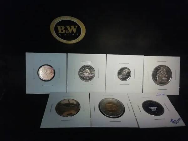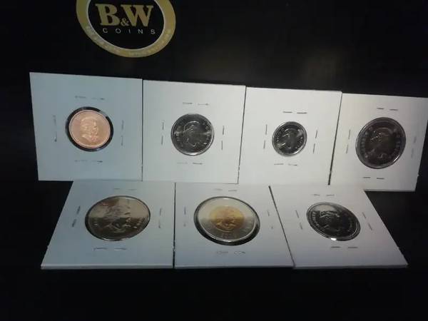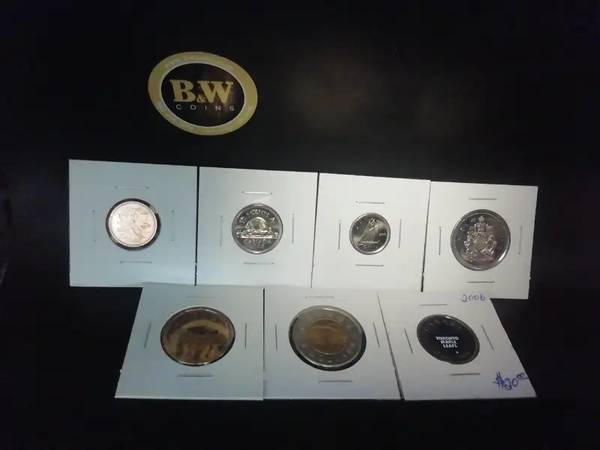 The 2006 Canada Coin Set features a complete collection of circulating coins from that year. It includes the 1-cent (penny), 5-cent (nickel), 10-cent (dime), 25-cent (quarter), 50-cent (half dollar), 1-dollar (Loonie), and 2-dollar (Toonie) coins. Each coin showcases iconic Canadian symbols: the penny features maple leaves, the nickel has a beaver, the dime shows the Bluenose schooner, the quarter depicts a caribou, and the half-dollar displays the Canadian Coat of Arms. The Loonie features a loon, and the Toonie has a polar bear. The set is known for its sharp minting quality and is popular among collectors for its timeless Canadian imagery.