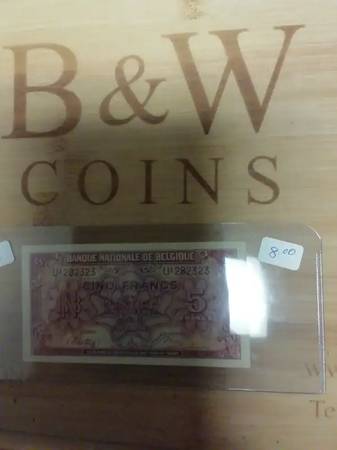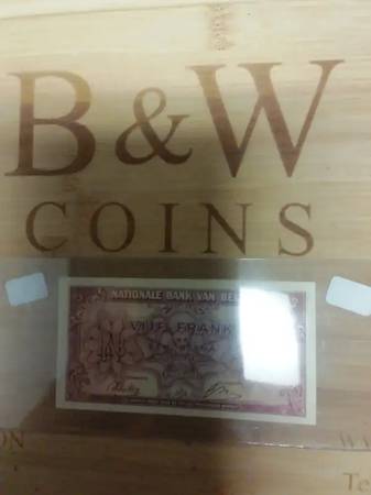 This red-pink-colored Belgian 5 cinq francs ou un belga banknote was issued in London by the Belgian government in exile during WWII. The note contains the words ‘banque nationale de Belgique’.