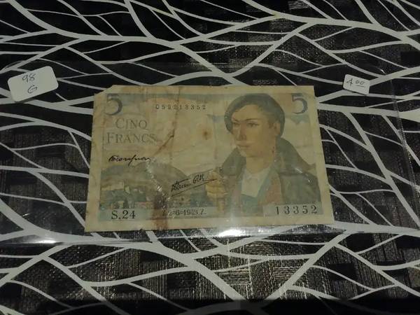 The 1943 5 Cinq Francs banknote, with the designation 98 G, represents a piece of French currency issued during the midst of World War II. Despite the tumultuous period, this banknote carries historical significance and artistic value. Its design likely reflects the prevailing themes and symbols of the time, potentially featuring patriotic motifs or representations of French resilience. The "98 G" designation may refer to specific variations or series within the broader category of 1943 5 Francs notes. As a collectible item, it serves as a tangible artifact of wartime France, offering insights into the nation's economic and cultural landscape during a challenging era. Collectors prize such banknotes for their historical context and scarcity, preserving them as valuable pieces of numismatic history.