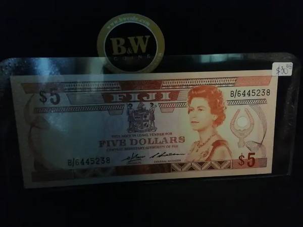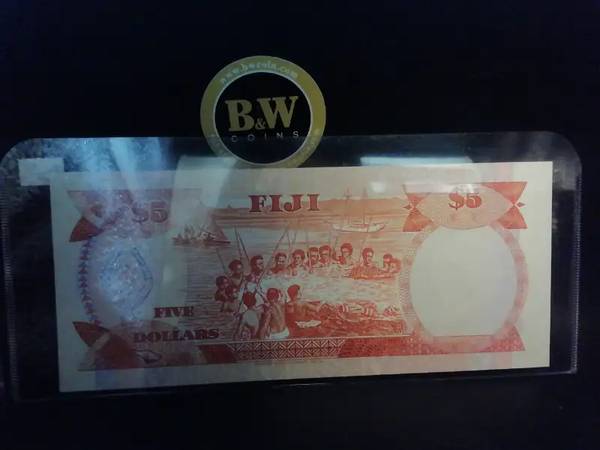 The Fiji Five Dollars banknote is a vibrant and colorful representation of the nation's culture and natural beauty. The obverse features an image of the native bird, the Collared Lory (Kula), symbolizing Fiji's rich biodiversity. Traditional Fijian patterns and designs surround the central image, enhancing its cultural significance. The reverse side depicts a picturesque Fijian landscape, often featuring the country's iconic flora and coastal scenery. With its striking green hues and intricate details, the five-dollar note is a blend of nature and tradition, making it both a functional currency and a beautiful representation of Fiji's identity.