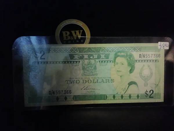 The Fiji Two Dollars banknote showcases the country's rich cultural heritage and natural beauty. The obverse features a portrait of Queen Elizabeth II, reflecting Fiji's historical ties to the British monarchy. Surrounding the portrait are intricate traditional Fijian designs and patterns. The reverse side displays an image of a local Fijian scene, often highlighting native flora, fauna, or significant landmarks. The note's vibrant colors and detailed design make it visually appealing, while its moderate denomination makes it a common part of everyday transactions in Fiji.