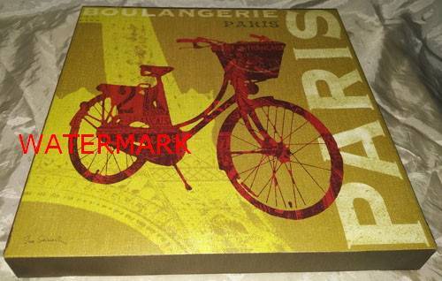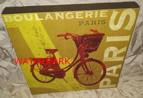 Giclée Print on Canvas depicting Red Bicycle watermarked, 'Francaise', with partial image of the Eiffel Tower, marked on right side, 'Paris', & on top, 'Boulangerie, Paris', copy signed, Su e Schl abach, on 100% North American Pine Wood Stretcher Bars: 11.6"x 11.6".