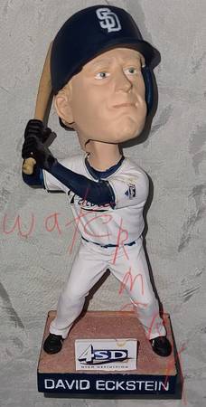 Original MLB (Major League Baseball) Player, David Eckstein in his #22 San Diego Padres (2009-2010) uniform, Bobblehead, 2010 Collectors Edition, 4SD High Definition BDA, Lot00317N0301, 7 1/2" × 3 1/8" D × 1.9" diameter base, in very good condition including surface wear on hand holding bat, & nick on bottom of base.