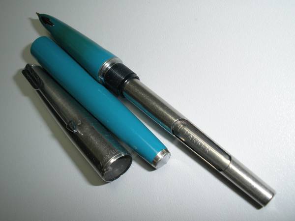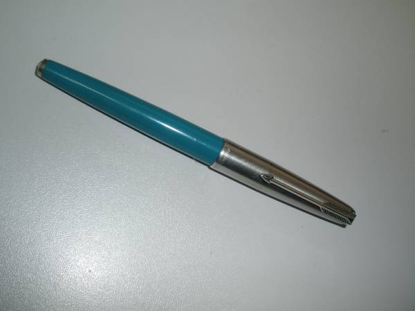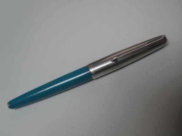 This vintage, Parker 61 Mark II Classic fountain pen, Vista Blue, 1962, 14K nib, capillary fill, light cosmetic wear, is in working condition.
