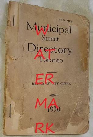 Rare Original Municipal Street Directory Toronto, Issued by City Clerk, 126 pgs., The Tower Printing & Publishing Company, Limited, Toronto, 1930, 5 3/4” x 4”, with wear including toning, some corner page creases, front cover separation, & bottom chips, missing back cover, pen script marks on back.