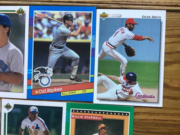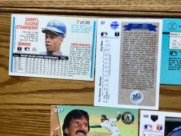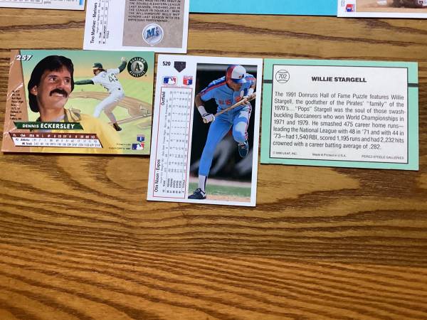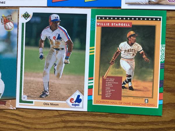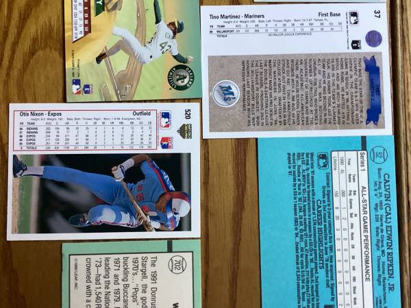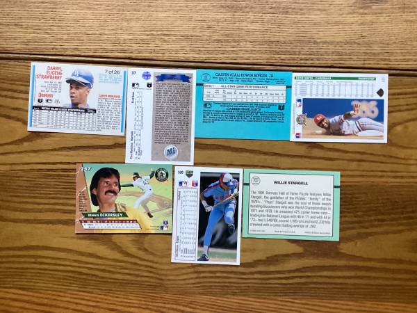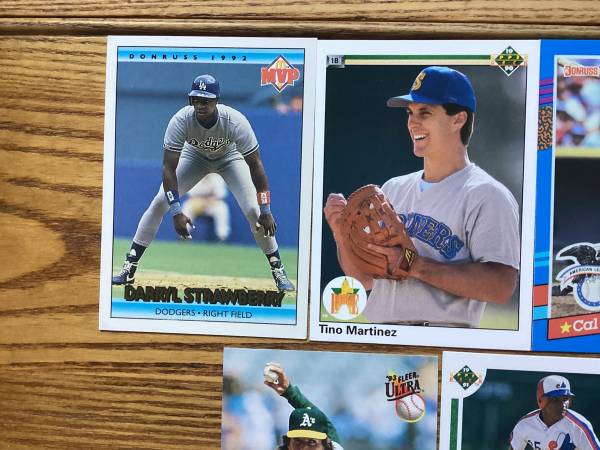 $15.00 CANADIAN for all 7 cards - MVP DARRYL STRAWBERRY #7 of 26, RC TINO MARTINEZ #37, CAL RIPKEN #52, OZZIE SMITH #177, DENNIS ECKERSLEY #257, OTIS NIXON #520, WILLIE STARGELL #702 - All clean & in excellent condition - Shipping available - Located at Pape ave & Cosburn Ave Toronto - Call Patrick @ show contact info