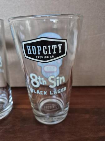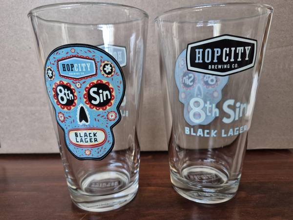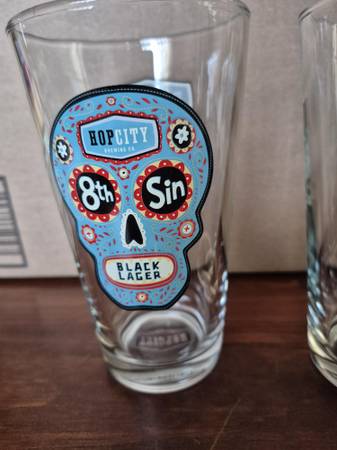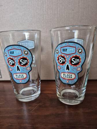 I have two Hop City 8th Sin Black Lager glasses with the sugar skull design. They're nicely made glasses, about 6.5" tall, with Hop City etched on the bottom of each and a vibrant skull design....