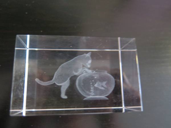 This is a lucite paperweight measuring 3.25# x 2". There is an interior image of a cat interested in a fish bowl - $20