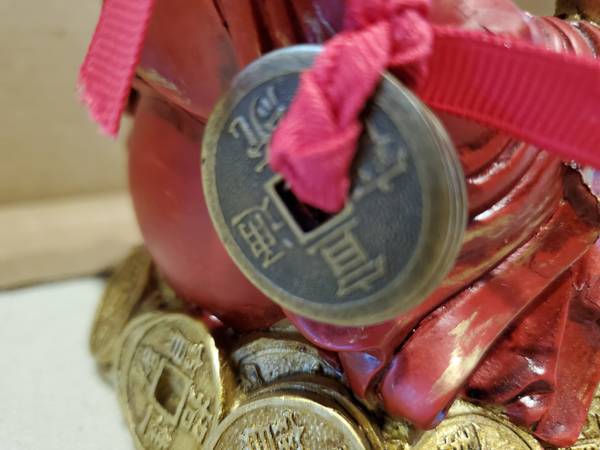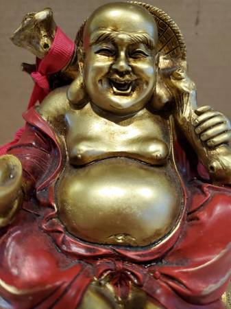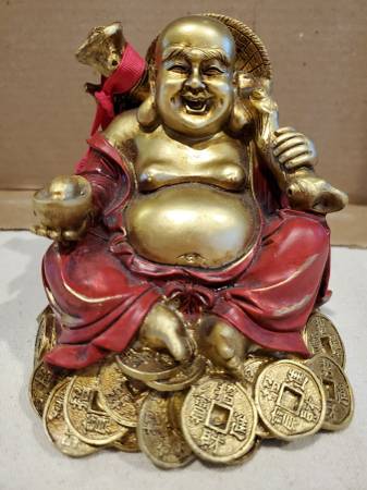 A smallish resin Laughing Buddha statue, in gold with red robe, sitting on a pile of coins. There are some real coins tied to the statue with red ribbon as well. It stands 5" tall, about 5" wide at...