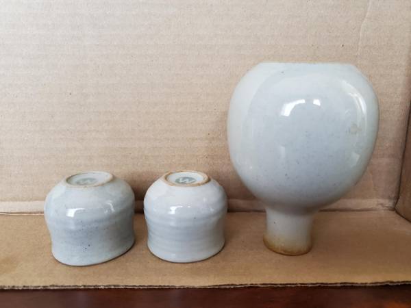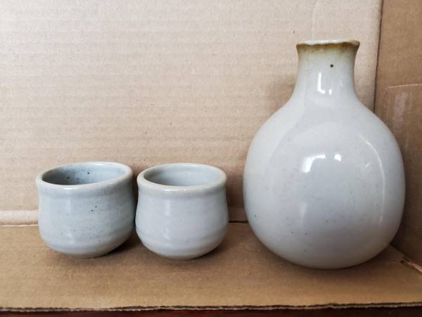 Not entirely sure what this is for, but it's a sweet little set of a rounded bottle and two cups. It's very small - the little cups are 1.75" tall and under 2" in diameter. The bottle is 4.5" tall. All 3 pieces are marked with a W on the bottom. $5.00 for the set, pick up only.