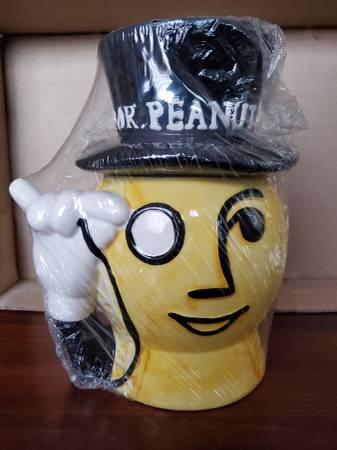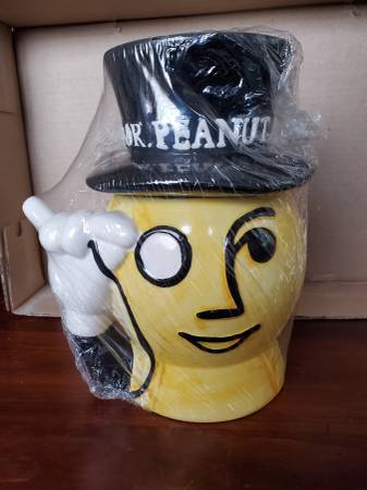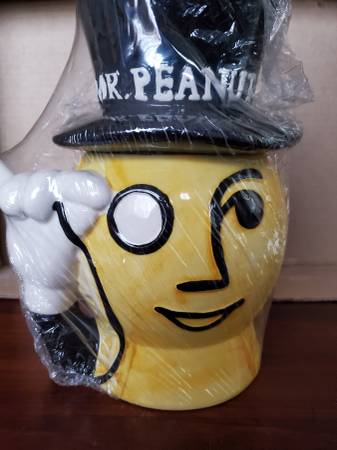 A new, still sealed "Mr. Peanut" ceramic cookie jar. It stands about 9.5" tall and is about 8" at its widest point. Still contains peanuts, but they are definitely inedible by now. $25.00 firm, pick...