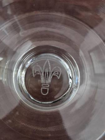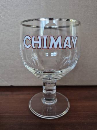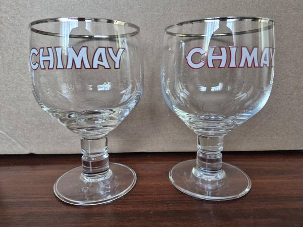 A pair of really good condition Chimay beer glasses - chalice-style. They're fairly small, designed for a regular sized bottle of Chimay - standing 5.75" tall, 3.25" in diameter at the mouth of the glass. There is a tiny fleur-de-lis etched at the bottom of the glass. Asking $10.00 for one glass or $15.00 for the pair, pick up only.