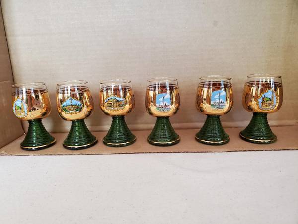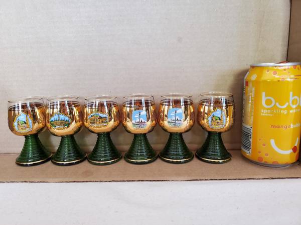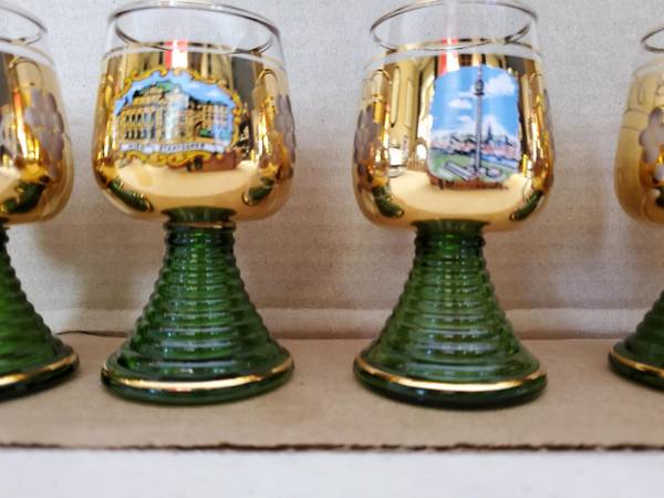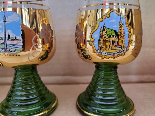 I have six gold and green little liqueur glasses. They stand about 3.25" tall and have conical green bases - a scene of Austria appears on the front, the back is a grape design in gold mirrored...