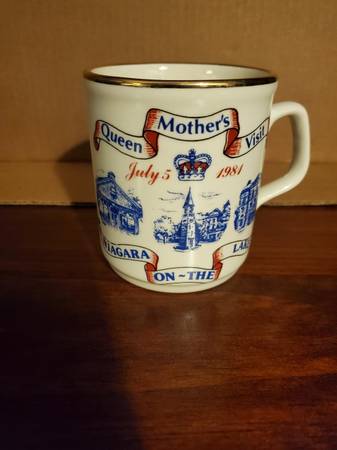 A nice souvenir mug commemorating the Queen Mum’s visit to Niagara on the Lake in 1981. In excellent condition for a 40-year old cup. Gold rim completely intact. Mug is made in England, decorated in...