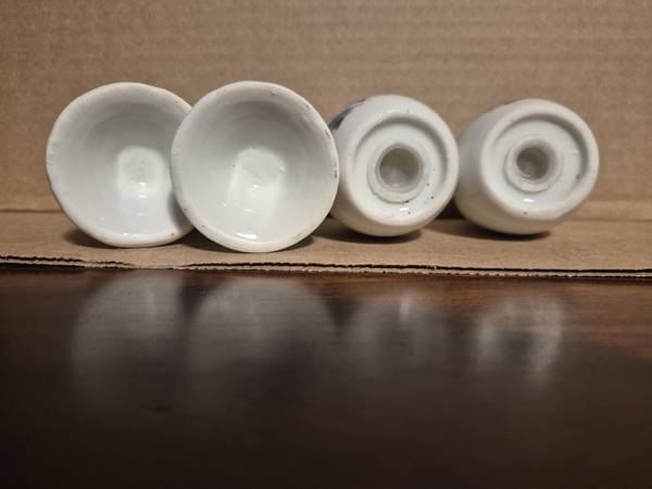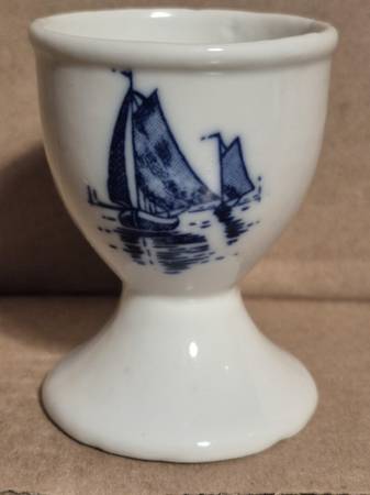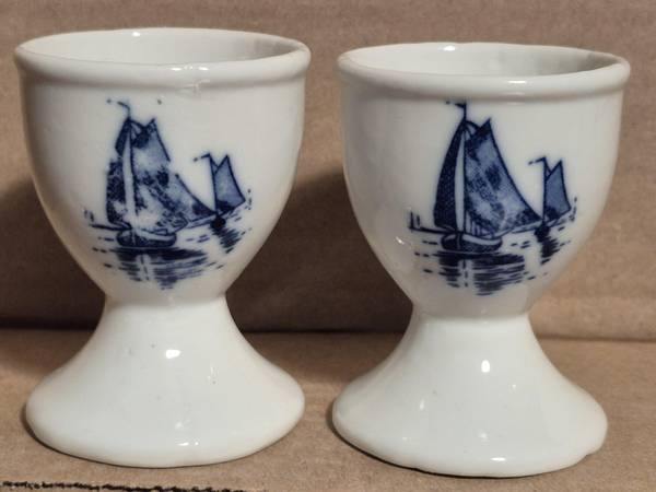 A pair of vintage egg cups, 2.75" tall. They're handmade with a flaw in the glaze, but no cracks. $5.00 for the pair A pair of salt & pepper shakers, 2.5" tall. They're intact, with the...