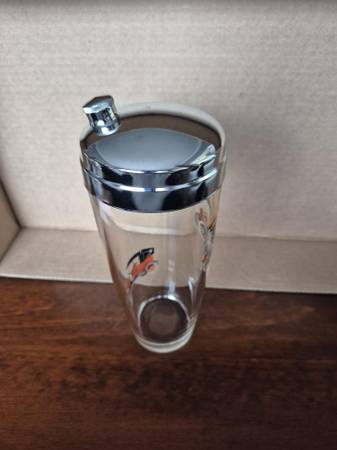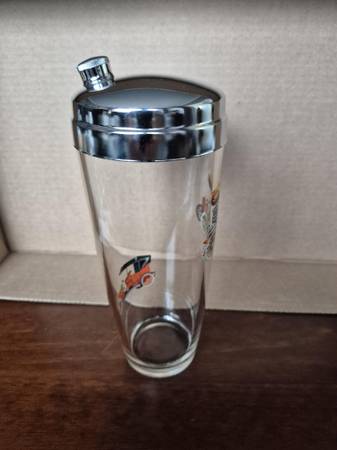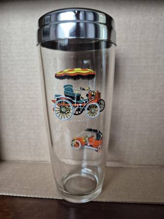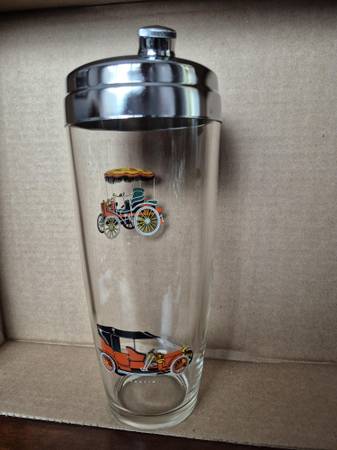 I have one glass cocktail shaker with chome lid. It's clear glass with two images of old-fashioned cars on it. Not sure of the make, but it's it great shape and quite heavy for it's size (9" tall)....