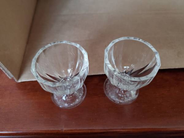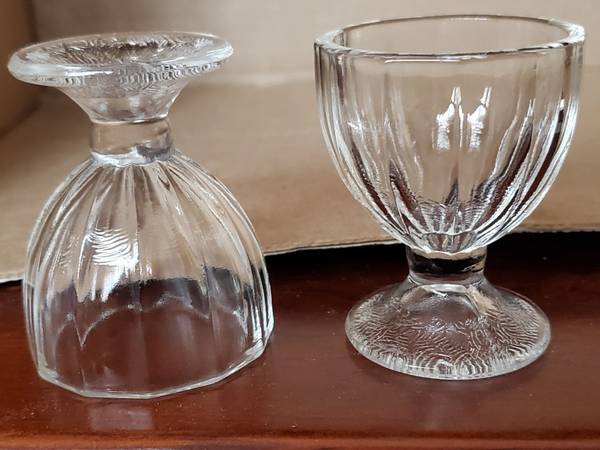 A pair of vintage Dominion Glass Egg Cups. They stand about 2.5" tall, and the diameter is 2". $5.00 for the pair, pick up only