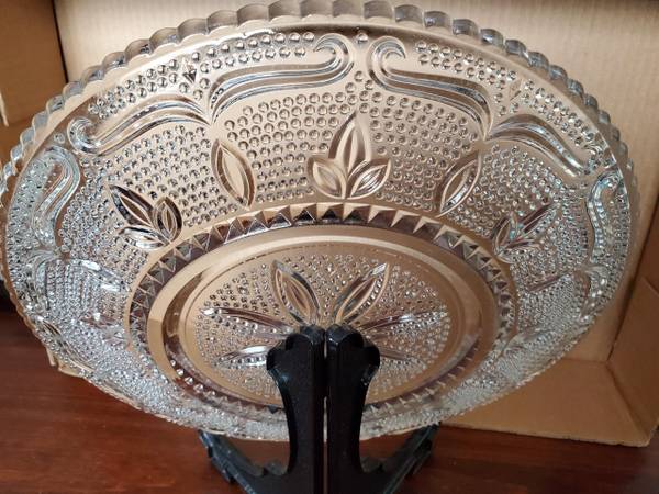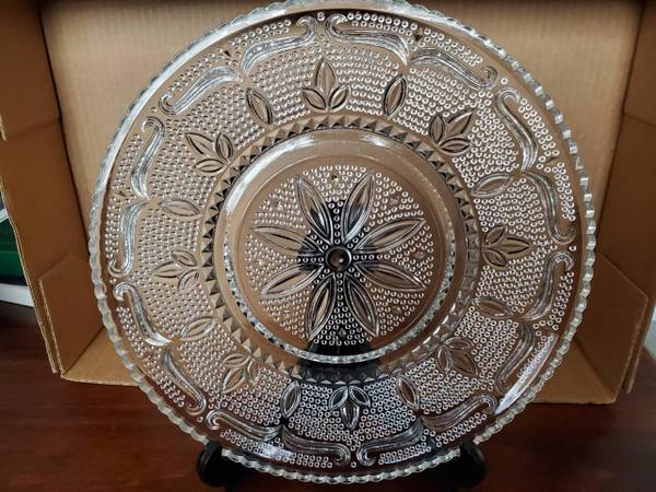 It’s clear glass – smooth on front with raised pattern on the back of the plate. No chips or cracks. It is 11.5” in diameter. Happy to include a plate hanger if desired. $5.00, pick up only