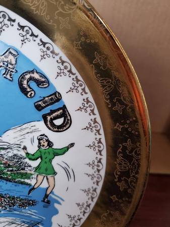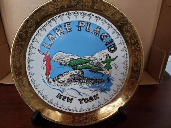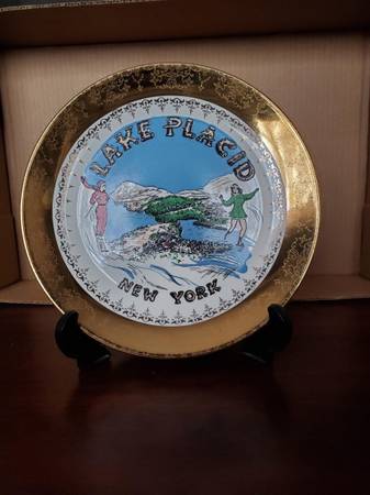 Fabulous vintage plate from Lake Placid, New York. Featuring a skier and a skater in the winter scene, the rim of the plate is done in 22 K gold. Made in the USA and marked "Crest-O-Gold", the plate...