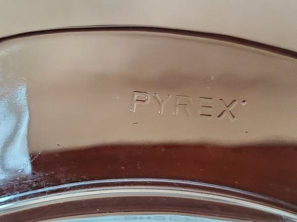A vintage Pyrex lid, made in England, fits most English round Pyrex dishes. Measures 9.75" (including handles) x 8" in diameter. $5.00, pick up only