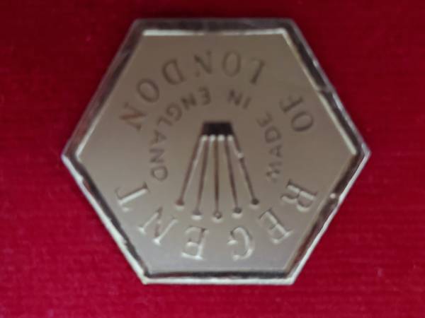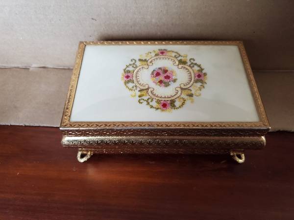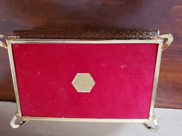 A small metal vanity/dressing table jewelry box - it's footed and gold-toned, marked "Made in England - Regent of London". It stands 2.5" tall, 6.25" long and about 3.75" wide. Pick up only, $10.00.