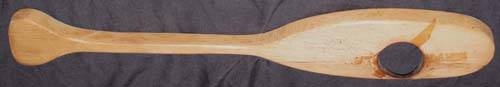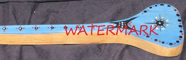 It's beautifully painted in bright colours of sky blue, etc., with raised beaded decoration on the paddle /oar's stem as well as the handle.