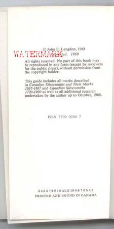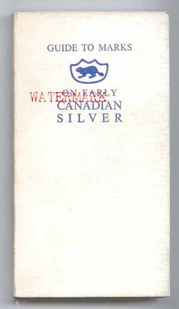 RARE 'GUIDE TO MARKS ON EARLY CANADIAN SILVER, 18th & 19th CENTURIES' (POCKET SIZE), approx. 374 PHOTO IMAGES OF SILVER MARKS, by John Langdon, 104 pgs., McGraw Hill Ryerson, Printed & Bound in Canada, 3rd Printing of 1st Edition,1969, 6 1/2" x 3 1/2", in very good condition with no tears, & clean text. This invaluable guide have all the marks illustrated in black & white. "MARKS described in Canadian Silversmiths and Their Marks 1667-1867 and Canadian Silversmiths 1700-1900 as well as all additional research undertaken by the Author up to Octoer, 1968....with a Special Supplement of Hendery & Leslie "House" Punches and the Marks of Dealers for whom they made Silver." ISBN: 0-7700-0244-7.