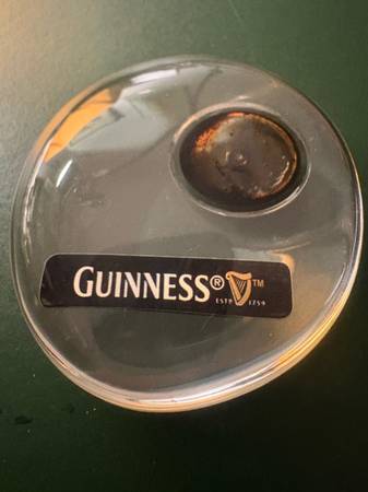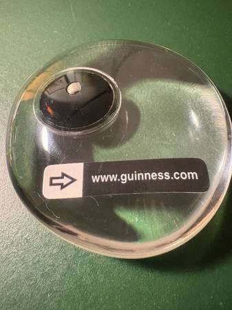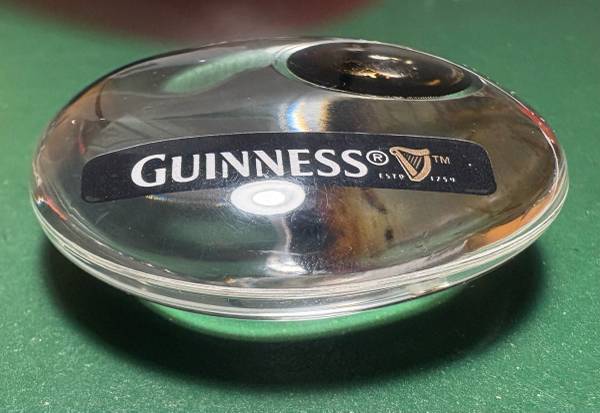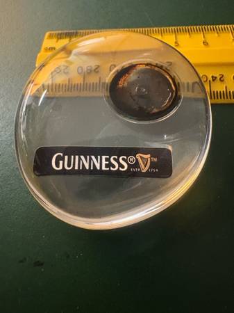 This heavy little Guinness resin paper weight is approximately 2 1/4 inches (58 mm) in diameter and 0.91 inches (23 mm) thick.