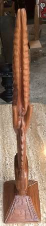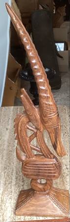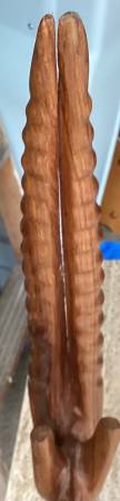 OLDER SOID WOOD HAND CARVED HORNED ANIMAL .DO NOT RECOGNIZE THE WOOD.LARGE CURVED HORNS ,WITH LONG FACE UPTURNED NOSE