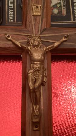 LOVELY OLDER SOLID WOOD (MAHOGANY? DARKTeak? ) CRUCIFIXION CROSS .MEASURES 10”(26 cms) x 5”(13cms) ..ANGLED ,BEVELLED EDGES WITH FLAT SIDES . THE CROSS OUTLINE IS EMPHASIZED BY INAID BRASS EDGING AROUND CHRIST .