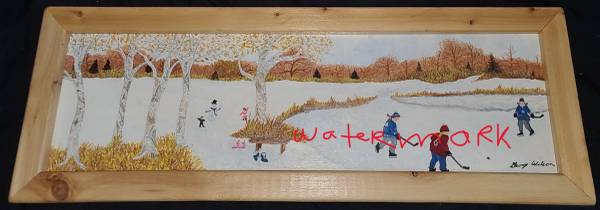 Original Canadian Folk Art Oil Painting on artist board by Ge orge Wi lson (b. 1971), depicting a Winter Landscape with Girls playing Hockey, with two wearing Toronto Maple Leaf Jerseys, & the other probably a Montreal Canadians one, Original Handmade Wooden Frame: 27.35” x 9 3/4”; Sight Image: 24 3/4” x 7”; Full Image: 25.85” x 8 1/8”, in excellent condition.