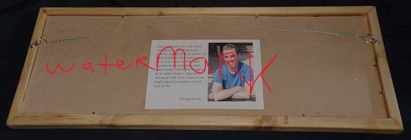 On the verso is a label with photo image of the artist marked, “Born in Toronto in 1971, the major influences in my life were by parents, natives of Nova Scotia and Newfoundland. Their history in these most scenic of Provinces inspired me to paint many east coast scenes. Starting at the age of 40 in Exeter Ontario I became a self-taught folk artist. I love to use bright colours to express my outlook on life.”