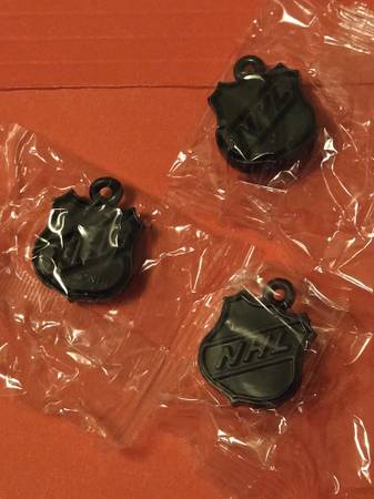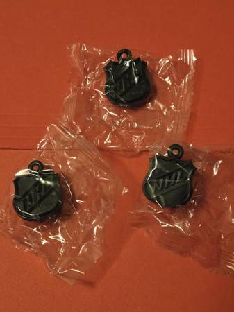 *** 2007 NHL HOCKEY LOGO SHIELD / PUCK PENDANTS / CHARMS *** NHL Officially Licensed Product Prizes found in Milk Chocolate Egg Candies. 1) NHL Pucks x 2 (1 Opened / 1 Un-Opened) 2) NHL Logo Shields...