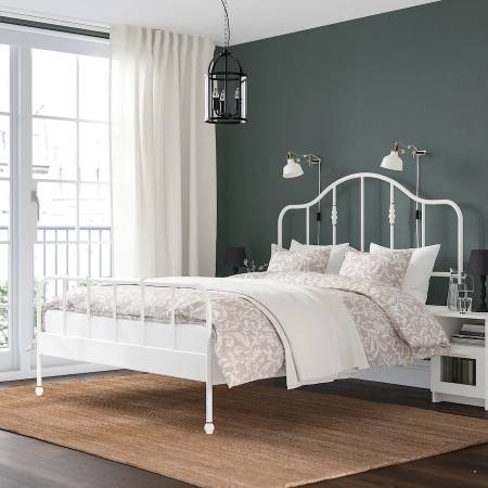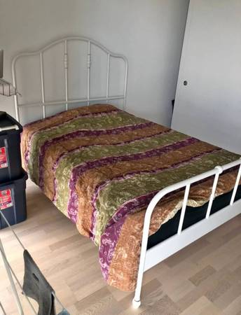 Ikea white double/full black steel with brass-colored details on the headboard, footboard and legs. There’s plenty of space under the bed for storage boxes. The frame is solid and sturdy and in very good condition, mildly used. It’s easy to maintain. It comes with slats and midbeam.