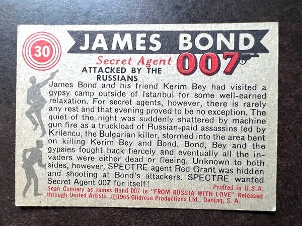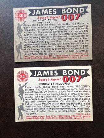 $3 for both or $2 each. Original James Bond 007 Trading Cards - From Russia With Love Series. Glidrose Productions 1965 Each card has a very small mark or defect. #30 - $2 #34 - $2 See other items...