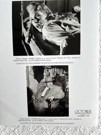 2 Orson Welles TOUCH OF EVIL (1958) stills from the Restoration Reissue in 1998. $14 for both or $8 each. Still #1 - 8 x 10" glossy b&w. $8 Still #1 - 8 x 10" glossy b&w with Charlton...
