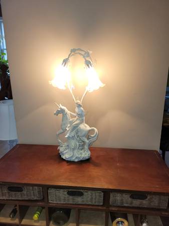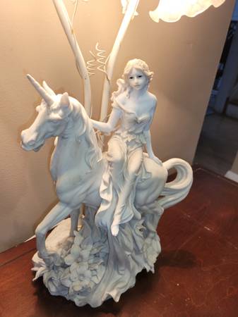 Intricate and ornate, each detail has been well attended to and is accented and highlighted by the different angles of each of the two frosted lily lamps. The woman's hair blows behind her in the wind. Her shift billows down and behind her in graceful lines that flow to her feet. The horse she rides is depicted mid gallop, with its powerful legs posed above grassy terrain.