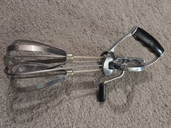Classic 1950s–1960s EKCO (USA) hand-crank egg beater. - Black Bakelite handles, heavy chrome beaters - 10" long – smooth-turning gears, no rust - Excellent vintage working condition (light honest...