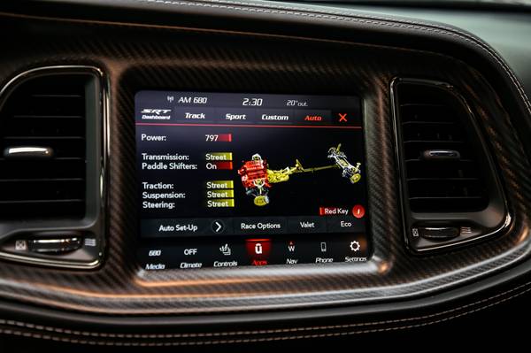 6.2 Liter SRT HEMI V8 Supercharged Engine Producing 797 Horsepower / 8 Speed Automatic Transmission with Paddle Shifters / Customer Preferred Package 27Q / Plus Group / Carbon and Suede Interior Package / Technology Group / Driver Convenience Group / Harman Kardon Sound Group / Laguna Leather Package / Red Seat Belts / Power Sunroof / SRT Barracuda Spoiler / Satin Black Hood / 20 Inch Carbon Black Lightweight Aluminum Wheels