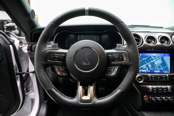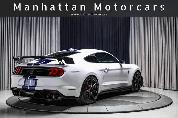 Shelby GT500, Amazing Oxford White with High Gloss Kona Blue Painted Stripe Exterior on Ebony Leather Interior with Grey Accents and Carbon Fiber Interior Trim, 20 Inch Exposed Carbon Fiber Wheels, Adjustable Strut Top Mounts, Exposed Carbon Fiber Lip, Exposed Carbon Fiber GT4 Track Wing, Rear Seat Delete, RECARO Leather Bucket Seats, Splitter Wickers, 12 Speaker Bang & Olufsen Sound System, Blind Spot Information System (BLIS) with Cross Traffic Alert, Voice Activated Touchscreen Navigation System, Apple Carplay, Android Auto, Heated Sideview Mirrors, Rearview Camera System, Remote Engine Start System, Leather and Alcantara Wrapped Flat Bottom Steering Wheel with Paddle Shifters, Auto Dimming Interior Mirror, Dual Zone Automatic Climate Control, Power Decklid Release, Remote Keyless Entry, Intelligent Access, Power Windows, and so many more options to list. A Must See.