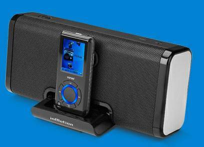 The inMotion iM510 is a compact, portable, powered speaker system designed specifically for select Sansa digital music players. The Sansa c200 series or e200 series MP3 player dock directly to the inMotion iM510 using the supplied adapters, allowing you to easily play your music files. A rear panel USB port allows you to sync your Sansa MP3 player with your PC. A 3.5mm auxiliary input lets you connect additional portable audio components to the inMotion iM510.