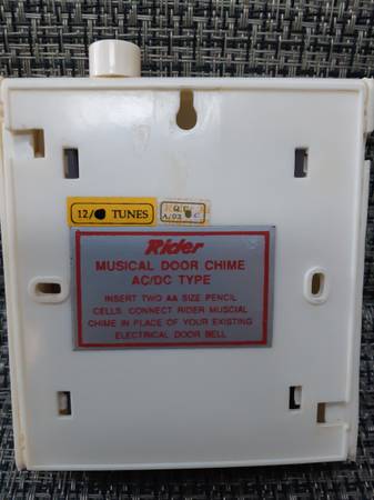 For Sale: RIDER 12 CHIME MUSICAL DOOR BELL VOLUME CONTROL (Brand New). It is good condition. Price: $20.00 (Cash only). Contact email, text message to . Note: Come to pick up.
