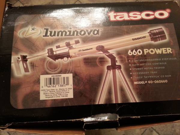 Tasco Luminova Telescope. Model 40060660. Like new in the box. 660x magnification. Includes tripod.
