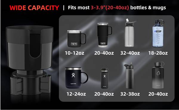 DYLEN Cup Holder Expander for Car, Car Cup Holder Extender Adapter with Expandable Base, Fits Yeti, Hydroflask 26/32/40 oz, Large Water Bottles in 3.2”-3.8” (20-40oz)