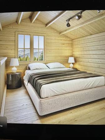 This stunning cabin delivers 100 sq. ft. of bright, open living space (11' x 14'6") with a dramatic 15' high offset-slope vaulted ceiling that creates an impressive sense of volume.