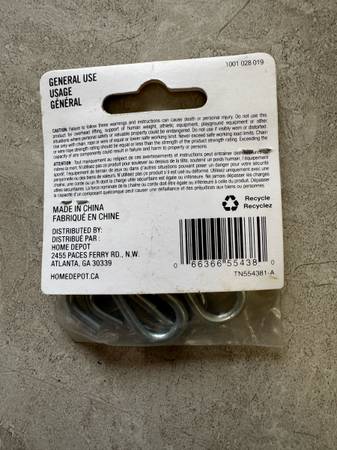 Selling a pack of Everbilt 5/32 inch S-hooks. These are zinc plated and come in a pack of 4. They're great for easy connection to rope, chain, cable and accessories. The working load is 35 lbs or 16 kg.
