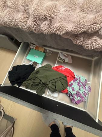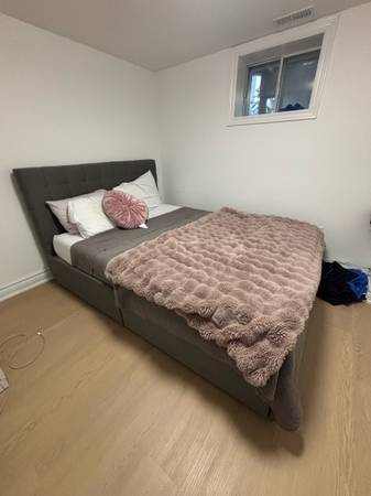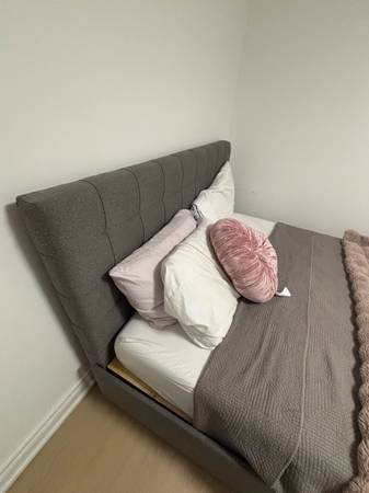 Selling a grey queen upholstered bed frame. It's in good shape and has 4 convenient storage drawers underneath. Perfect for adding a touch of style and functionality to your bedroom!