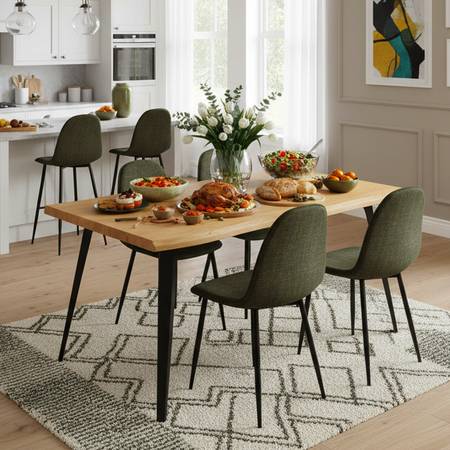 This set features a live-edge walnut table and soft fabric chairs with black metal legs. Ideal for condos, open dining rooms, or Airbnb spaces needing a modern touch. Easy to assemble and maintain, with a smooth surface that wipes clean.